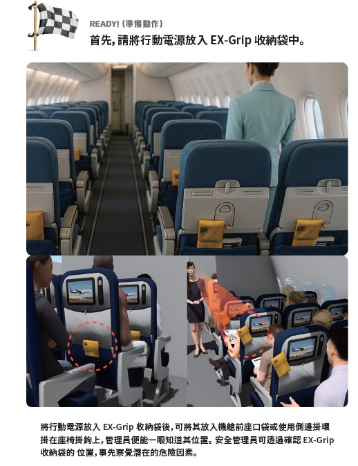 可放於前座口袋或座椅掛勾,讓機艙服務員能快速識別位置。若發生電池異常,能立即帶袋浸水處理非常適合作為航空旅遊的安全配備。